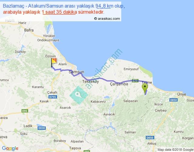 Bazlamaç - Atakum Samsun arası yaklaşık olarak 90 km/h ile yukarıda belirtilen sürede olup, iki yerin kuş uçuşu uzaklığı (mesafesi) 73'dir. Yolculuk otobüsle 2 saat 3 dakika sürmektedir.