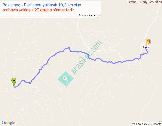 Bazlamaç - Evci arası yaklaşık olarak 90 km/h ile yukarıda belirtilen sürede olup, iki yerin kuş uçuşu uzaklığı (mesafesi) 8'dir. Yolculuk otobüsle 35 dakika sürmektedir.