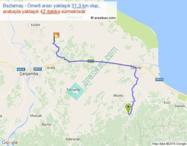 Bazlamaç - Ömerli arası yaklaşık olarak 90 km/h ile yukarıda belirtilen sürede olup, iki yerin kuş uçuşu uzaklığı (mesafesi) 20'dir. Yolculuk otobüsle 54 dakika sürmektedir.