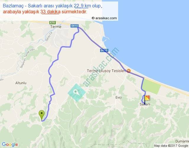 Bazlamaç - Sakarlı arası yaklaşık olarak 90 km/h ile yukarıda belirtilen sürede olup, iki yerin kuş uçuşu uzaklığı (mesafesi) 10'dir. Yolculuk otobüsle 42 dakika sürmektedir.
