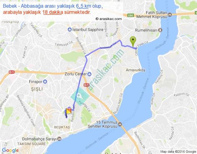 Bebek - Abbasağa arası yaklaşık olarak 90 km/h ile yukarıda belirtilen sürede olup, iki yerin kuş uçuşu uzaklığı (mesafesi) 4'dir. Yolculuk otobüsle 23 dakika sürmektedir.