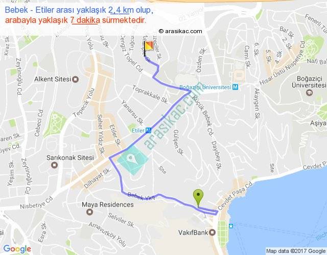 Bebek - Etiler arası yaklaşık olarak 90 km/h ile yukarıda belirtilen sürede olup, iki yerin kuş uçuşu uzaklığı (mesafesi) 1'dir. Yolculuk otobüsle 9 dakika sürmektedir.