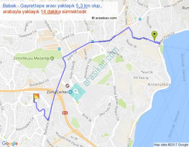 Bebek - Gayrettepe arası yaklaşık olarak 90 km/h ile yukarıda belirtilen sürede olup, iki yerin kuş uçuşu uzaklığı (mesafesi) 3'dir. Yolculuk otobüsle 18 dakika sürmektedir.