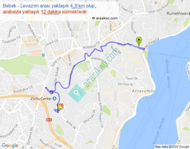 Bebek - Levazım arası yaklaşık olarak 90 km/h ile yukarıda belirtilen sürede olup, iki yerin kuş uçuşu uzaklığı (mesafesi) 2'dir. Yolculuk otobüsle 15 dakika sürmektedir.