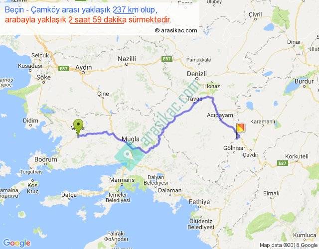 Beçin - Çamköy arası yaklaşık olarak 90 km/h ile yukarıda belirtilen sürede olup, iki yerin kuş uçuşu uzaklığı (mesafesi) 154'dir. Yolculuk otobüsle 3 saat 52 dakika sürmektedir.