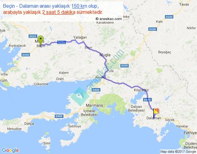 Beçin - Dalaman arası yaklaşık olarak 90 km/h ile yukarıda belirtilen sürede olup, iki yerin kuş uçuşu uzaklığı (mesafesi) 105'dir. Yolculuk otobüsle 2 saat 42 dakika sürmektedir.