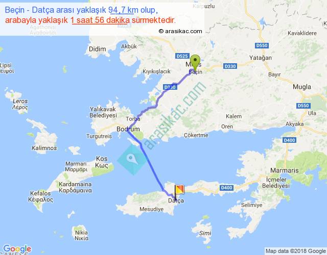 Beçin - Datça arası yaklaşık olarak 90 km/h ile yukarıda belirtilen sürede olup, iki yerin kuş uçuşu uzaklığı (mesafesi) 61'dir. Yolculuk otobüsle 2 saat 30 dakika sürmektedir.