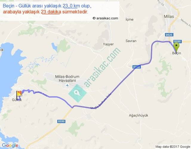 Beçin - Güllük arası yaklaşık olarak 90 km/h ile yukarıda belirtilen sürede olup, iki yerin kuş uçuşu uzaklığı (mesafesi) 17'dir. Yolculuk otobüsle 29 dakika sürmektedir.