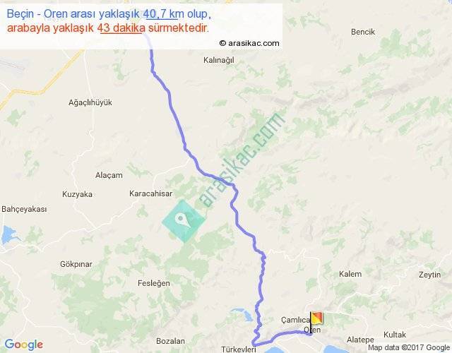 Beçin - Oren arası yaklaşık olarak 90 km/h ile yukarıda belirtilen sürede olup, iki yerin kuş uçuşu uzaklığı (mesafesi) 30'dir. Yolculuk otobüsle 55 dakika sürmektedir.