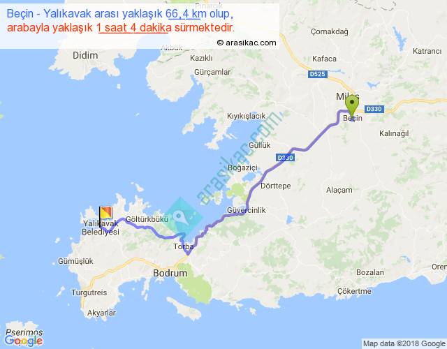 Beçin - Yalıkavak arası yaklaşık olarak 90 km/h ile yukarıda belirtilen sürede olup, iki yerin kuş uçuşu uzaklığı (mesafesi) 47'dir. Yolculuk otobüsle 1 saat 23 dakika sürmektedir.