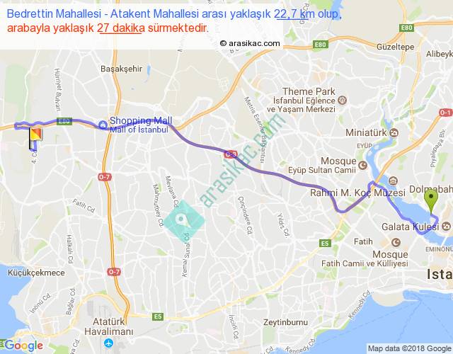 Bedrettin Mahallesi - Atakent Mahallesi arası yaklaşık olarak 90 km/h ile yukarıda belirtilen sürede olup, iki yerin kuş uçuşu uzaklığı (mesafesi) 16'dir. Yolculuk otobüsle 35 dakika sürmektedir.