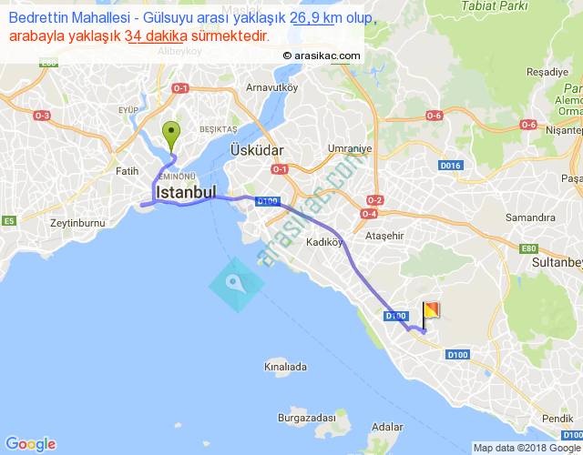 Bedrettin Mahallesi - Gülsuyu arası yaklaşık olarak 90 km/h ile yukarıda belirtilen sürede olup, iki yerin kuş uçuşu uzaklığı (mesafesi) 19'dir. Yolculuk otobüsle 44 dakika sürmektedir.