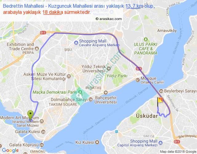 Bedrettin Mahallesi - Kuzguncuk Mahallesi arası yaklaşık olarak 90 km/h ile yukarıda belirtilen sürede olup, iki yerin kuş uçuşu uzaklığı (mesafesi) 6'dir. Yolculuk otobüsle 23 dakika sürmektedir.