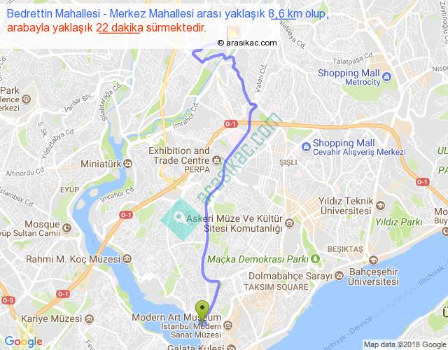 Bedrettin Mahallesi - Merkez Mahallesi arası yaklaşık olarak 90 km/h ile yukarıda belirtilen sürede olup, iki yerin kuş uçuşu uzaklığı (mesafesi) 6'dir. Yolculuk otobüsle 28 dakika sürmektedir.
