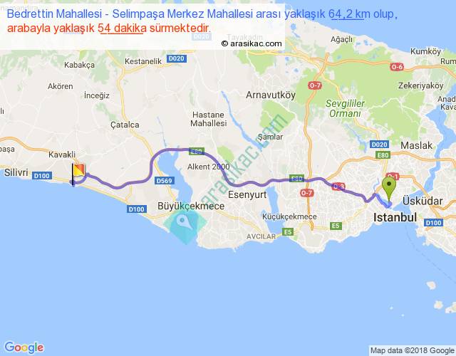 Bedrettin Mahallesi - Selimpaşa Merkez Mahallesi arası yaklaşık olarak 90 km/h ile yukarıda belirtilen sürede olup, iki yerin kuş uçuşu uzaklığı (mesafesi) 51'dir. Yolculuk otobüsle 1 saat 10 dakika sürmektedir.