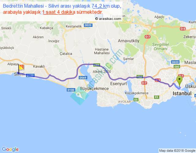 Bedrettin Mahallesi - Silivri arası yaklaşık olarak 90 km/h ile yukarıda belirtilen sürede olup, iki yerin kuş uçuşu uzaklığı (mesafesi) 60'dir. Yolculuk otobüsle 1 saat 23 dakika sürmektedir.