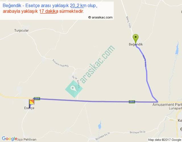 Beğendik - Esetçe arası yaklaşık olarak 90 km/h ile yukarıda belirtilen sürede olup, iki yerin kuş uçuşu uzaklığı (mesafesi) 12'dir. Yolculuk otobüsle 22 dakika sürmektedir.