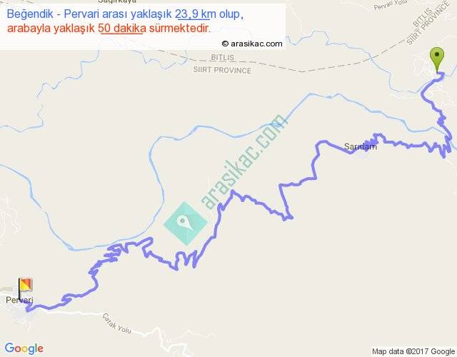 Beğendik - Pervari arası yaklaşık olarak 90 km/h ile yukarıda belirtilen sürede olup, iki yerin kuş uçuşu uzaklığı (mesafesi) 10'dir. Yolculuk otobüsle 1 saat 5 dakika sürmektedir.