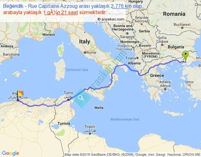 Beğendik - Rue Capitaine Azzoug arası yaklaşık olarak 90 km/h ile yukarıda belirtilen sürede olup, iki yerin kuş uçuşu uzaklığı (mesafesi) 2066'dir. Eğer belirtilen yerler arasında uçak seferi var ise bu süre uçakla 3 saat 10 dakika'ya kadar düşebilir. Yolculuk otobüsle 2 gün 10 saat sürmektedir.
