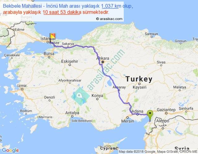 Bekbele Mahallesi - İnönü Mah arası yaklaşık olarak 90 km/h ile yukarıda belirtilen sürede olup, iki yerin kuş uçuşu uzaklığı (mesafesi) 777'dir. Eğer belirtilen yerler arasında uçak seferi var ise bu süre uçakla 1 saat 11 dakika'ya kadar düşebilir. Yolculuk otobüsle 14 saat 8 dakika sürmektedir.