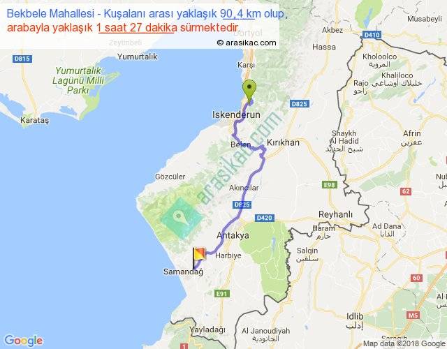 Bekbele Mahallesi - Kuşalanı arası yaklaşık olarak 90 km/h ile yukarıda belirtilen sürede olup, iki yerin kuş uçuşu uzaklığı (mesafesi) 61'dir. Yolculuk otobüsle 1 saat 53 dakika sürmektedir.