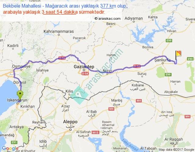 Bekbele Mahallesi - Mağaracık arası yaklaşık olarak 90 km/h ile yukarıda belirtilen sürede olup, iki yerin kuş uçuşu uzaklığı (mesafesi) 257'dir. Eğer belirtilen yerler arasında uçak seferi var ise bu süre uçakla 23 dakika'ya kadar düşebilir. Yolculuk otobüsle 5 saat 4 dakika sürmektedir.