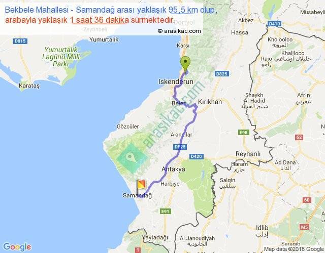 Bekbele Mahallesi - Samandağ arası yaklaşık olarak 90 km/h ile yukarıda belirtilen sürede olup, iki yerin kuş uçuşu uzaklığı (mesafesi) 63'dir. Yolculuk otobüsle 2 saat 4 dakika sürmektedir.
