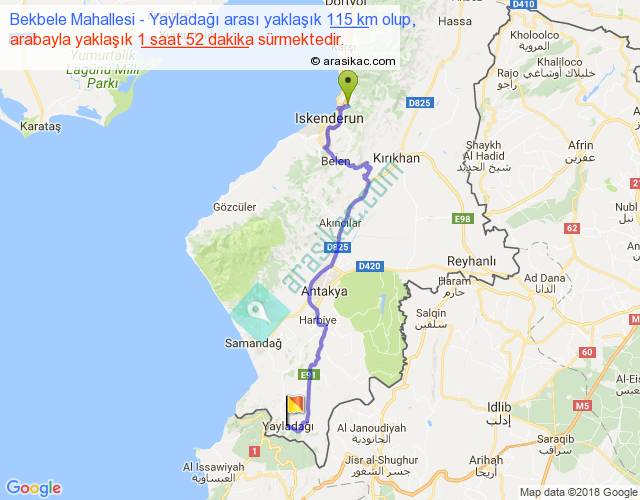 Bekbele Mahallesi - Yayladağı arası yaklaşık olarak 90 km/h ile yukarıda belirtilen sürede olup, iki yerin kuş uçuşu uzaklığı (mesafesi) 80'dir. Yolculuk otobüsle 2 saat 25 dakika sürmektedir.