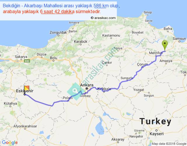 Bekdiğin - Akarbaşı Mahallesi arası yaklaşık olarak 90 km/h ile yukarıda belirtilen sürede olup, iki yerin kuş uçuşu uzaklığı (mesafesi) 465'dir. Eğer belirtilen yerler arasında uçak seferi var ise bu süre uçakla 42 dakika'ya kadar düşebilir. Yolculuk otobüsle 8 saat 42 dakika sürmektedir.