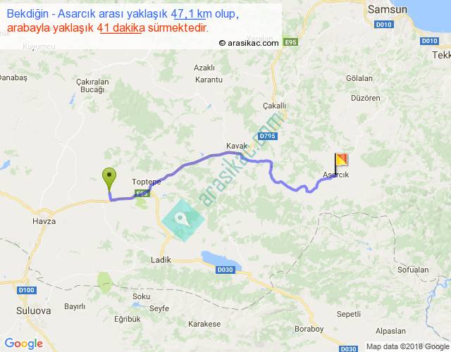 Bekdiğin - Asarcık arası yaklaşık olarak 90 km/h ile yukarıda belirtilen sürede olup, iki yerin kuş uçuşu uzaklığı (mesafesi) 37'dir. Yolculuk otobüsle 53 dakika sürmektedir.