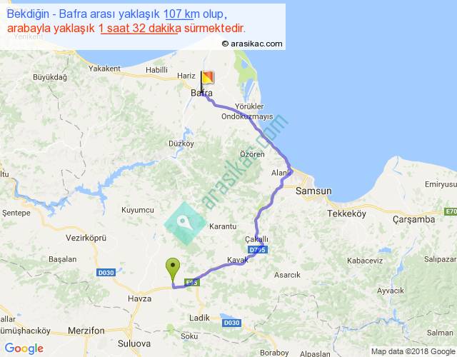Bekdiğin - Bafra arası yaklaşık olarak 90 km/h ile yukarıda belirtilen sürede olup, iki yerin kuş uçuşu uzaklığı (mesafesi) 62'dir. Yolculuk otobüsle 1 saat 59 dakika sürmektedir.