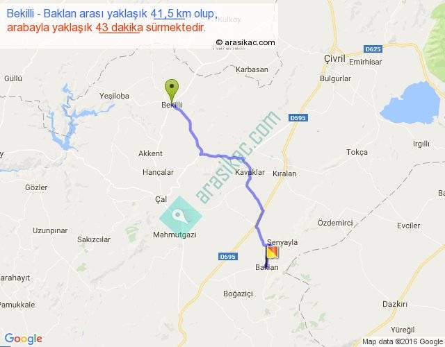 Bekilli - Baklan arası yaklaşık olarak 90 km/h ile yukarıda belirtilen sürede olup, iki yerin kuş uçuşu uzaklığı (mesafesi) 32'dir. Yolculuk otobüsle 55 dakika sürmektedir.