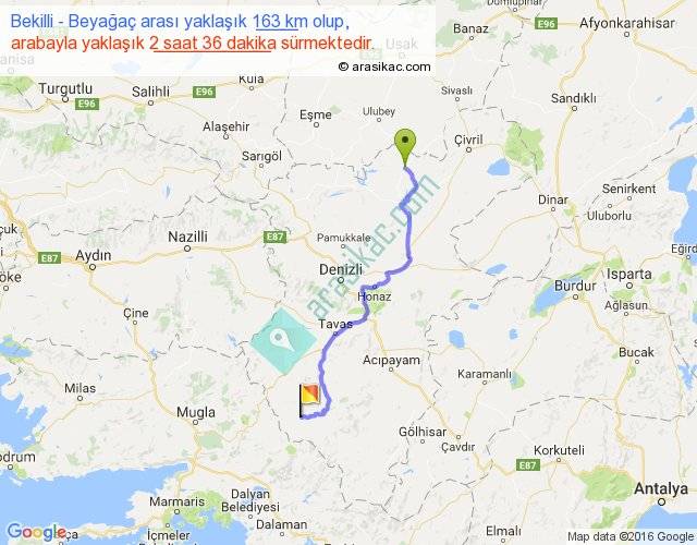 Bekilli - Beyağaç arası yaklaşık olarak 90 km/h ile yukarıda belirtilen sürede olup, iki yerin kuş uçuşu uzaklığı (mesafesi) 119'dir. Yolculuk otobüsle 3 saat 22 dakika sürmektedir.