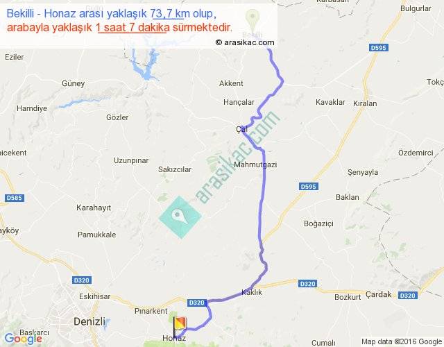 Bekilli - Honaz arası yaklaşık olarak 90 km/h ile yukarıda belirtilen sürede olup, iki yerin kuş uçuşu uzaklığı (mesafesi) 54'dir. Yolculuk otobüsle 1 saat 27 dakika sürmektedir.