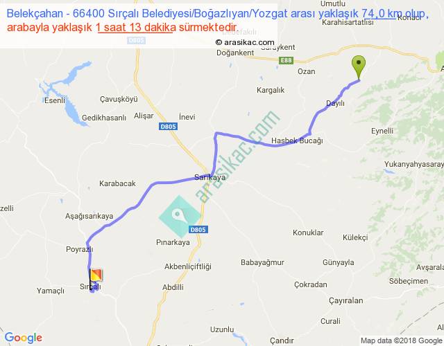 Belekçahan - 66400 Sırçalı Belediyesi Boğazlıyan Yozgat arası yaklaşık olarak 90 km/h ile yukarıda belirtilen sürede olup, iki yerin kuş uçuşu uzaklığı (mesafesi) 58'dir. Yolculuk otobüsle 1 saat 34 dakika sürmektedir.