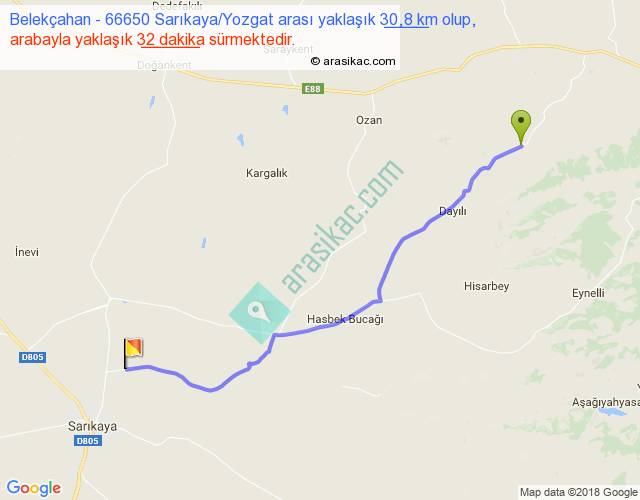 Belekçahan - 66650 Sarıkaya Yozgat arası yaklaşık olarak 90 km/h ile yukarıda belirtilen sürede olup, iki yerin kuş uçuşu uzaklığı (mesafesi) 27'dir. Yolculuk otobüsle 41 dakika sürmektedir.