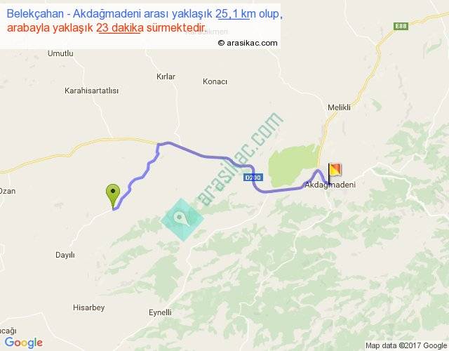 Belekçahan - Akdağmadeni arası yaklaşık olarak 90 km/h ile yukarıda belirtilen sürede olup, iki yerin kuş uçuşu uzaklığı (mesafesi) 18'dir. Yolculuk otobüsle 29 dakika sürmektedir.