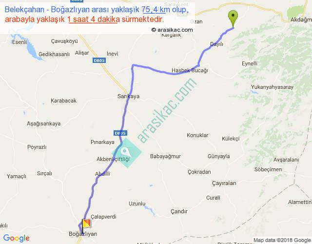 Belekçahan - Boğazlıyan arası yaklaşık olarak 90 km/h ile yukarıda belirtilen sürede olup, iki yerin kuş uçuşu uzaklığı (mesafesi) 61'dir. Yolculuk otobüsle 1 saat 23 dakika sürmektedir.