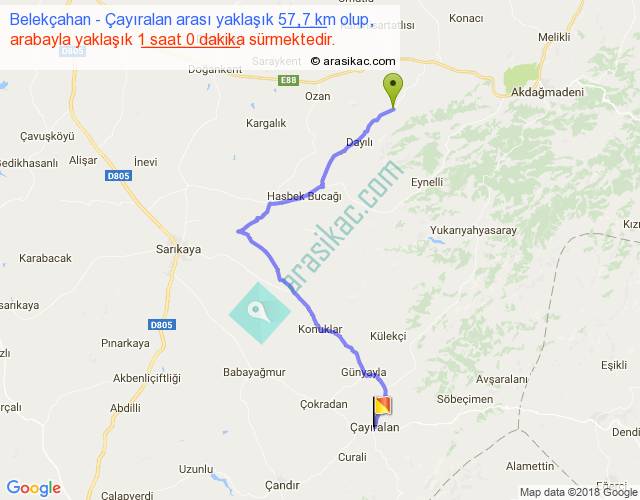 Belekçahan - Çayıralan arası yaklaşık olarak 90 km/h ile yukarıda belirtilen sürede olup, iki yerin kuş uçuşu uzaklığı (mesafesi) 37'dir. Yolculuk otobüsle 1 saat 18 dakika sürmektedir.