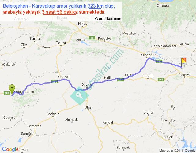 Belekçahan - Karayakup arası yaklaşık olarak 90 km/h ile yukarıda belirtilen sürede olup, iki yerin kuş uçuşu uzaklığı (mesafesi) 262'dir. Eğer belirtilen yerler arasında uçak seferi var ise bu süre uçakla 24 dakika'ya kadar düşebilir. Yolculuk otobüsle 5 saat 6 dakika sürmektedir.