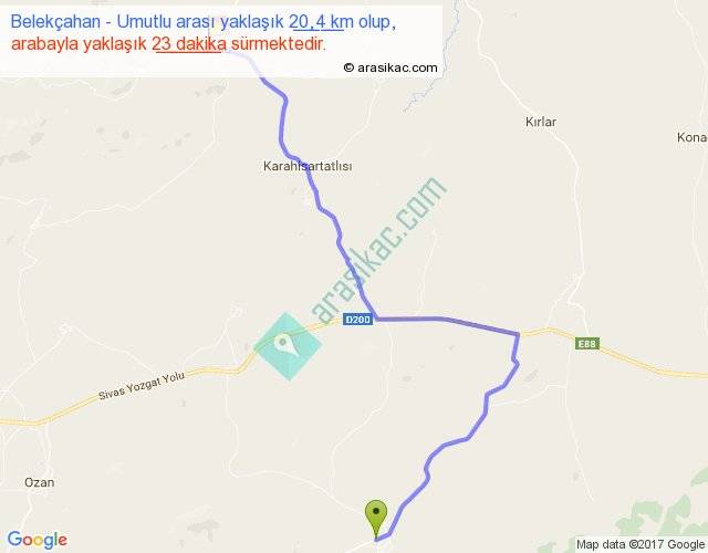 Belekçahan - Umutlu arası yaklaşık olarak 90 km/h ile yukarıda belirtilen sürede olup, iki yerin kuş uçuşu uzaklığı (mesafesi) 14'dir. Yolculuk otobüsle 29 dakika sürmektedir.