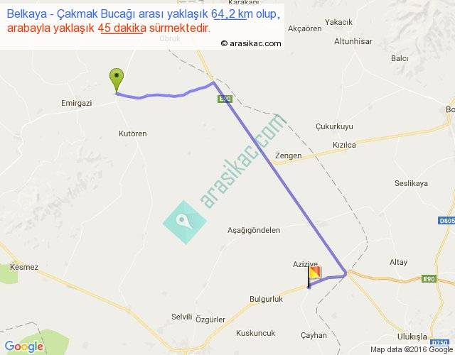 Belkaya - Çakmak Bucağı arası yaklaşık olarak 90 km/h ile yukarıda belirtilen sürede olup, iki yerin kuş uçuşu uzaklığı (mesafesi) 46'dir. Yolculuk otobüsle 58 dakika sürmektedir.