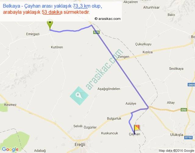Belkaya - Çayhan arası yaklaşık olarak 90 km/h ile yukarıda belirtilen sürede olup, iki yerin kuş uçuşu uzaklığı (mesafesi) 53'dir. Yolculuk otobüsle 1 saat 8 dakika sürmektedir.