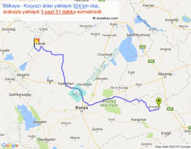 Belkaya - Koçyazı arası yaklaşık olarak 90 km/h ile yukarıda belirtilen sürede olup, iki yerin kuş uçuşu uzaklığı (mesafesi) 221'dir. Yolculuk otobüsle 5 saat 0 dakika sürmektedir.