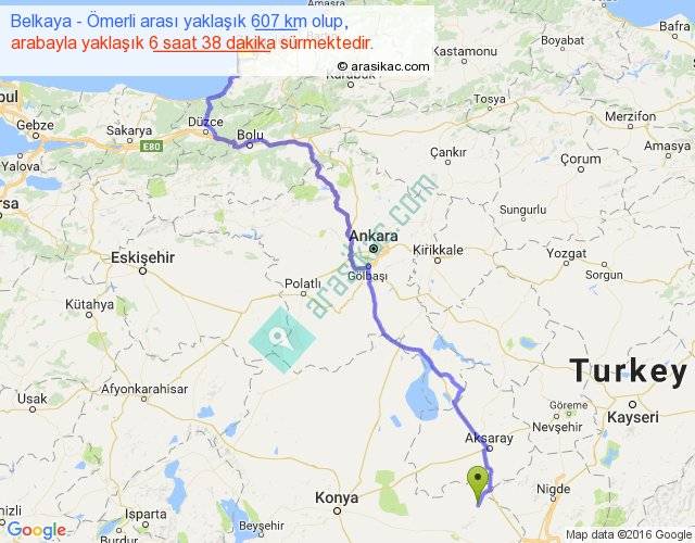 Belkaya - Ömerli arası yaklaşık olarak 90 km/h ile yukarıda belirtilen sürede olup, iki yerin kuş uçuşu uzaklığı (mesafesi) 425'dir. Eğer belirtilen yerler arasında uçak seferi var ise bu süre uçakla 39 dakika'ya kadar düşebilir. Yolculuk otobüsle 8 saat 37 dakika sürmektedir.