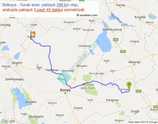 Belkaya - Yunak arası yaklaşık olarak 90 km/h ile yukarıda belirtilen sürede olup, iki yerin kuş uçuşu uzaklığı (mesafesi) 213'dir. Yolculuk otobüsle 4 saat 46 dakika sürmektedir.