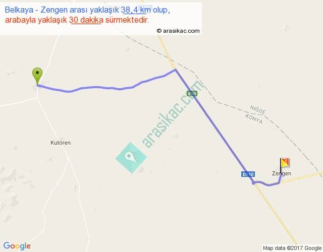 Belkaya - Zengen arası yaklaşık olarak 90 km/h ile yukarıda belirtilen sürede olup, iki yerin kuş uçuşu uzaklığı (mesafesi) 31'dir. Yolculuk otobüsle 39 dakika sürmektedir.