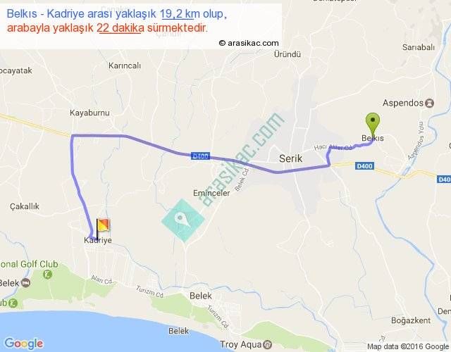 Belkıs - Kadriye arası yaklaşık olarak 90 km/h ile yukarıda belirtilen sürede olup, iki yerin kuş uçuşu uzaklığı (mesafesi) 13'dir. Yolculuk otobüsle 28 dakika sürmektedir.