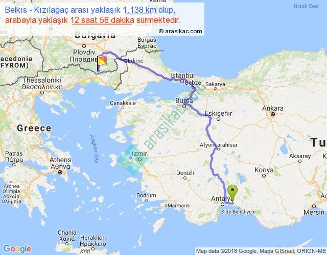 Belkıs - Kızılağaç arası yaklaşık olarak 90 km/h ile yukarıda belirtilen sürede olup, iki yerin kuş uçuşu uzaklığı (mesafesi) 694'dir. Eğer belirtilen yerler arasında uçak seferi var ise bu süre uçakla 1 saat 04 dakika'ya kadar düşebilir. Yolculuk otobüsle 16 saat 51 dakika sürmektedir.