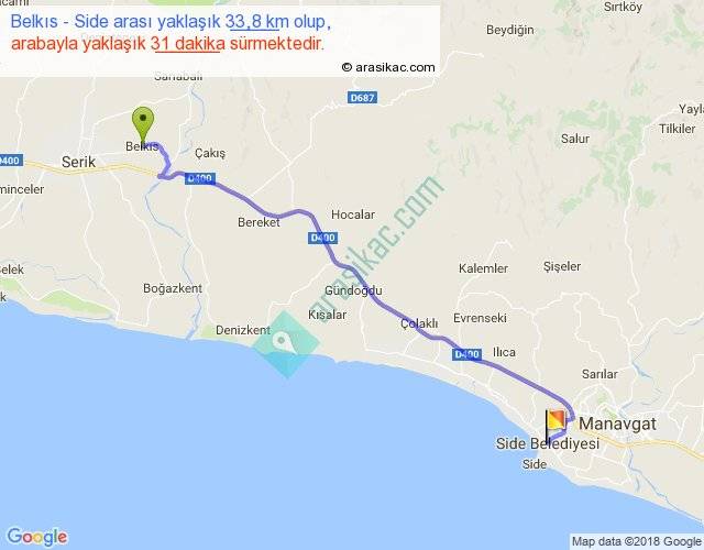 Belkıs - Side arası yaklaşık olarak 90 km/h ile yukarıda belirtilen sürede olup, iki yerin kuş uçuşu uzaklığı (mesafesi) 28'dir. Yolculuk otobüsle 40 dakika sürmektedir.